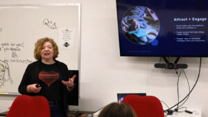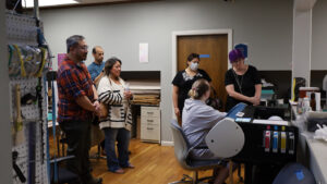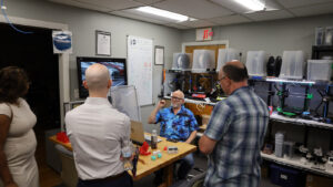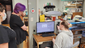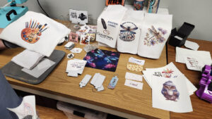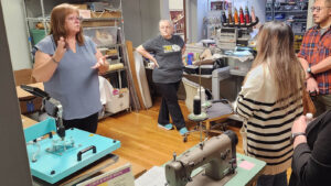 Guests enjoyed live demonstrations throughout the makerspace, including 3D printing with shop captain Dana Kelly, CNC routing with shop captain Shawn Ashe, machine embroidery with FAMM shop captain Judie Barnhill, heat press demonstrations by member Kelli Verrill, sticker printing and die cutting with member Nago Snow, media and photography by Media Studio shop captain Josh Mazgelis, laser engraving with member Dusty Santos, and digital marketing insights by Marketing Committee chair Andee Wilcott.