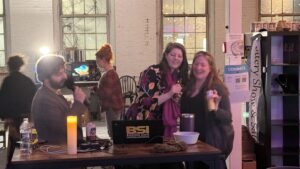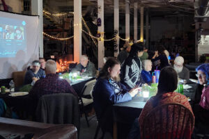 And wow, did our community come through. Members jumped in everywhere—setting up buffet tables and seating, stringing lights through the lounge, hauling in portable speakers and a projector, making a booze run, decorating with pine boughs and electric candles.